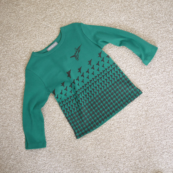 千鳥格子がだんだん変化して、最後はジェット機に。男の子らしいプリントは色使いもクッキリでカッコいい。