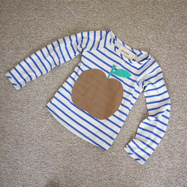 青/白のボーダーシャツに、大きなリンゴをプリント。ベーシック&キュートな、キッズらしいロンT。