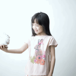 お花と一緒にたたずむウサギちゃん。 耳にはピンクのリボン付き。 夏のガーリースタイルにこんなT。
