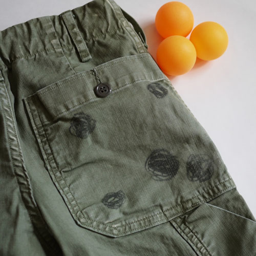 アーミーテイストのカーキのパンツに、ユーズド加工&